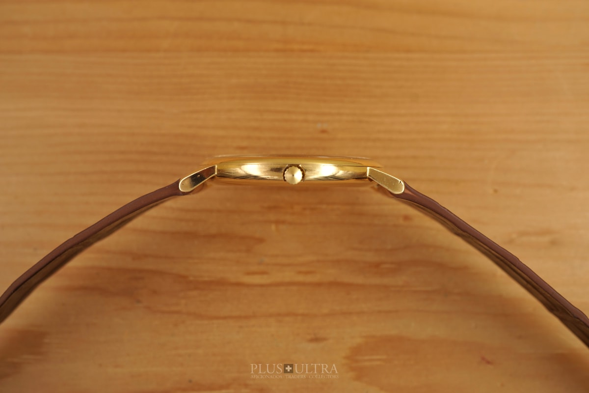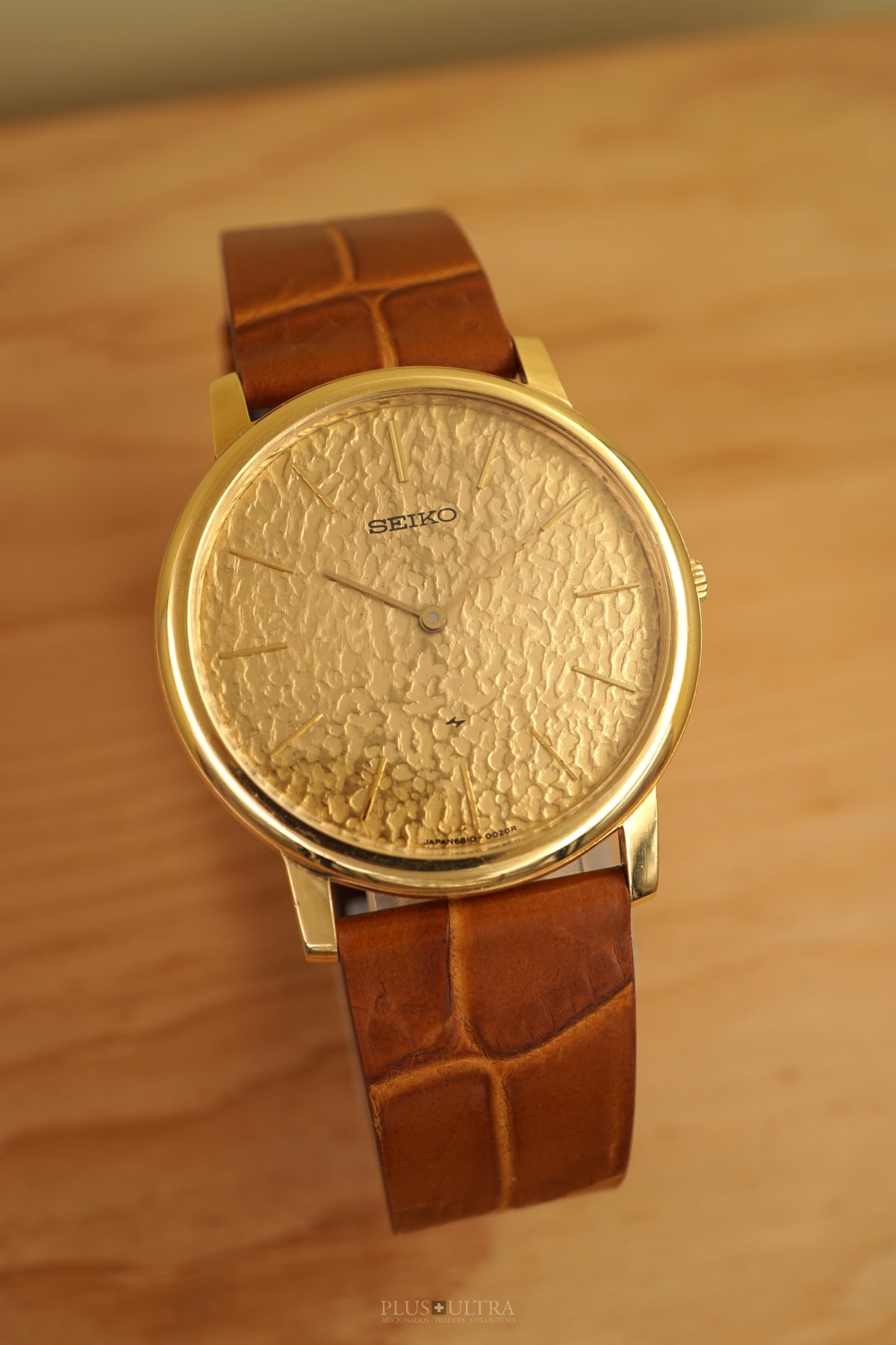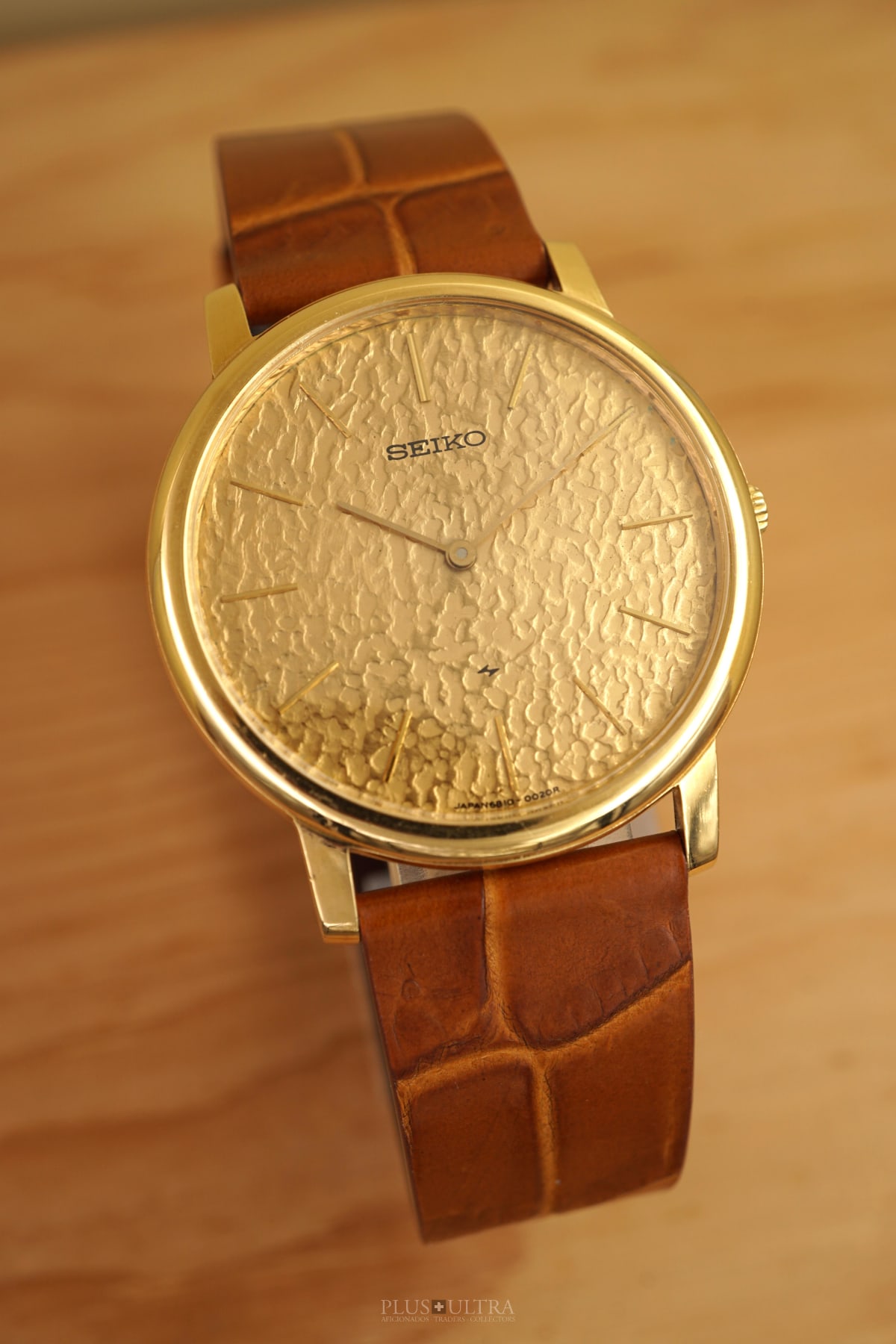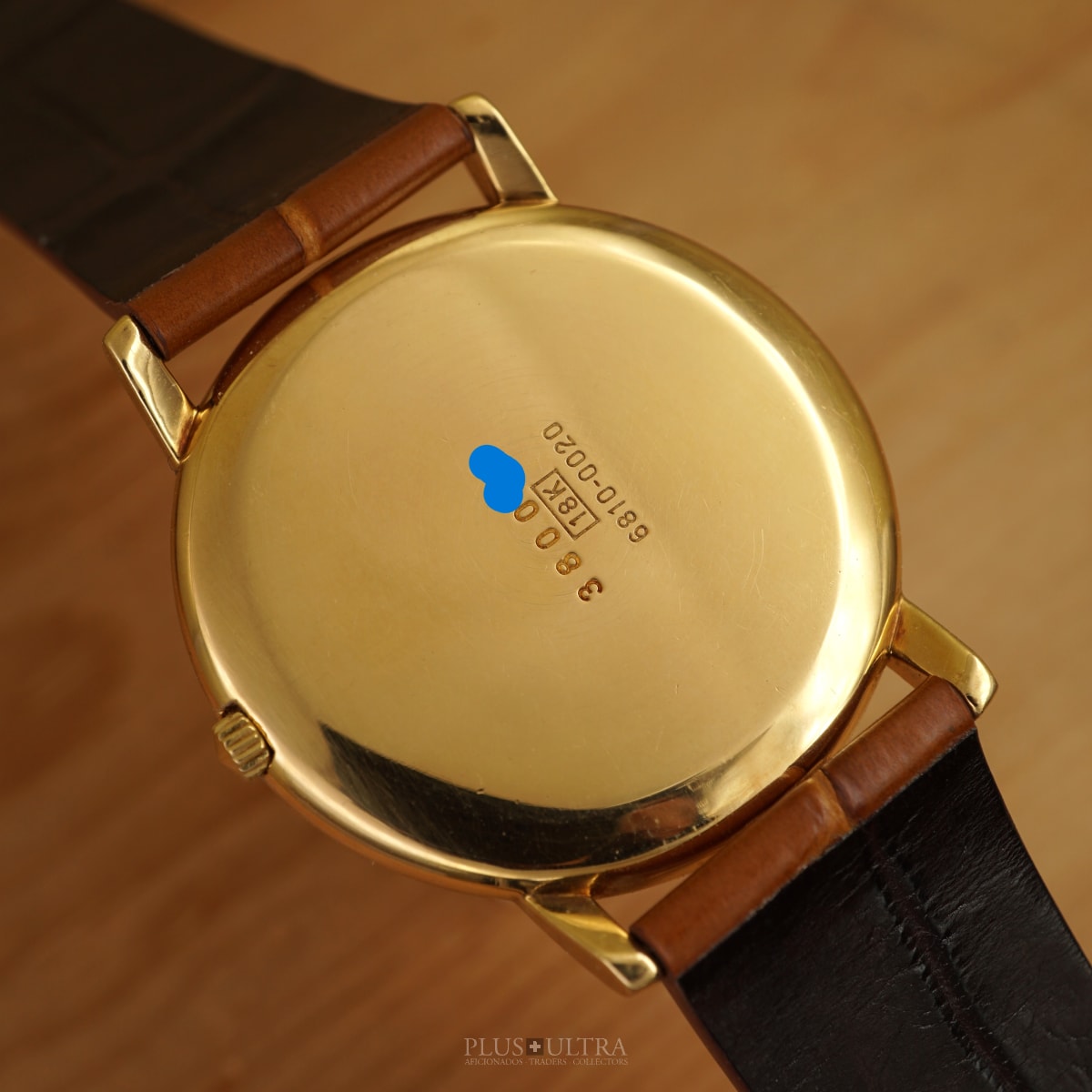 The ultrathin cal6810 -- based on the cal68 and nowadays still in use in the Credor GoldFeather in a refined version -- in one of the finest cases ever made from gold: heavy monocoque, classic understatement and perfect in every aspect. Made in just a few pieces in 1973 & 1974 -- we assume less than 100 were produced -- and that is exactly what 1974 became the Seiko sub-brand Credor: crête de or, crest of gold; this case was the namesake.