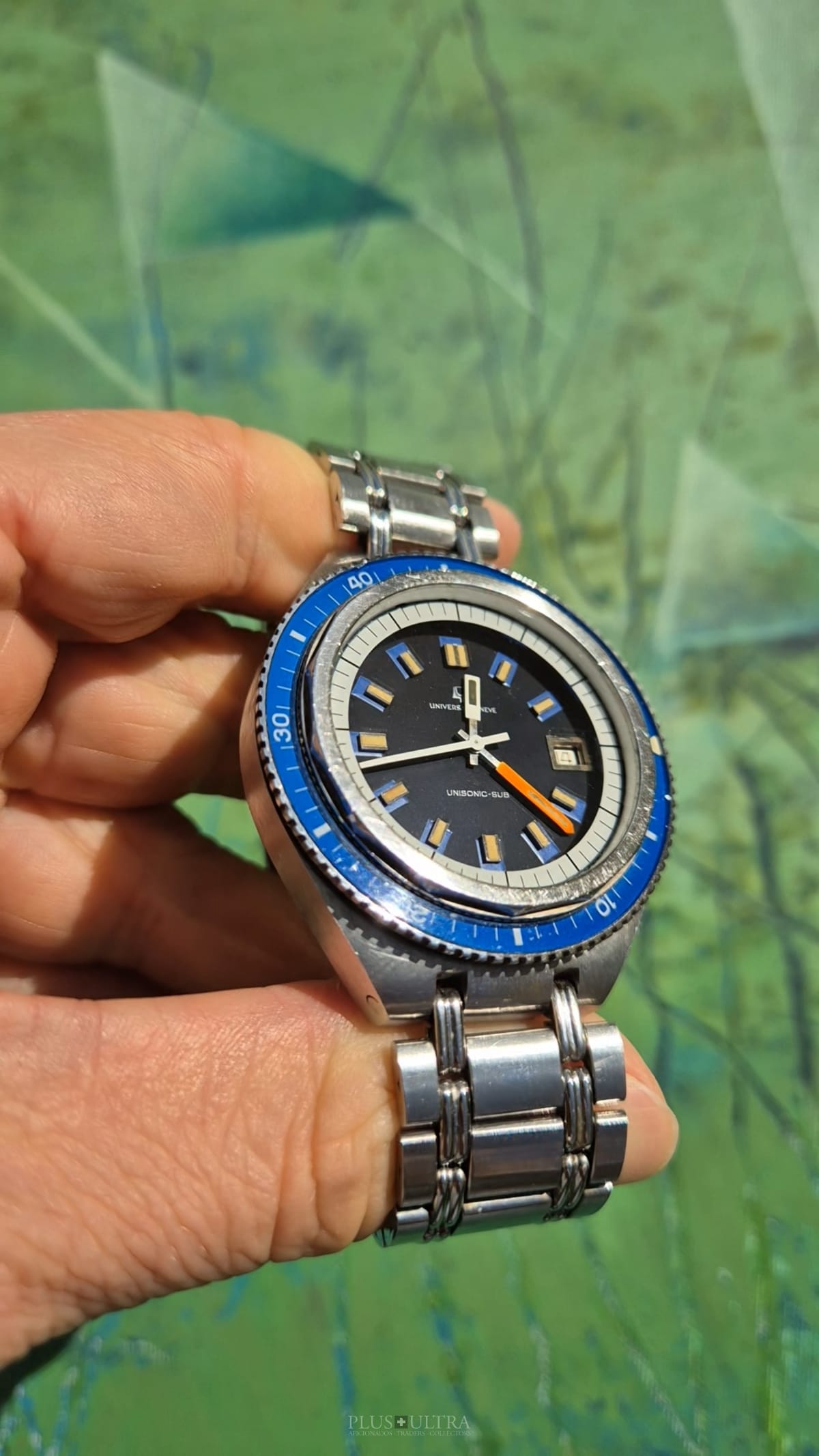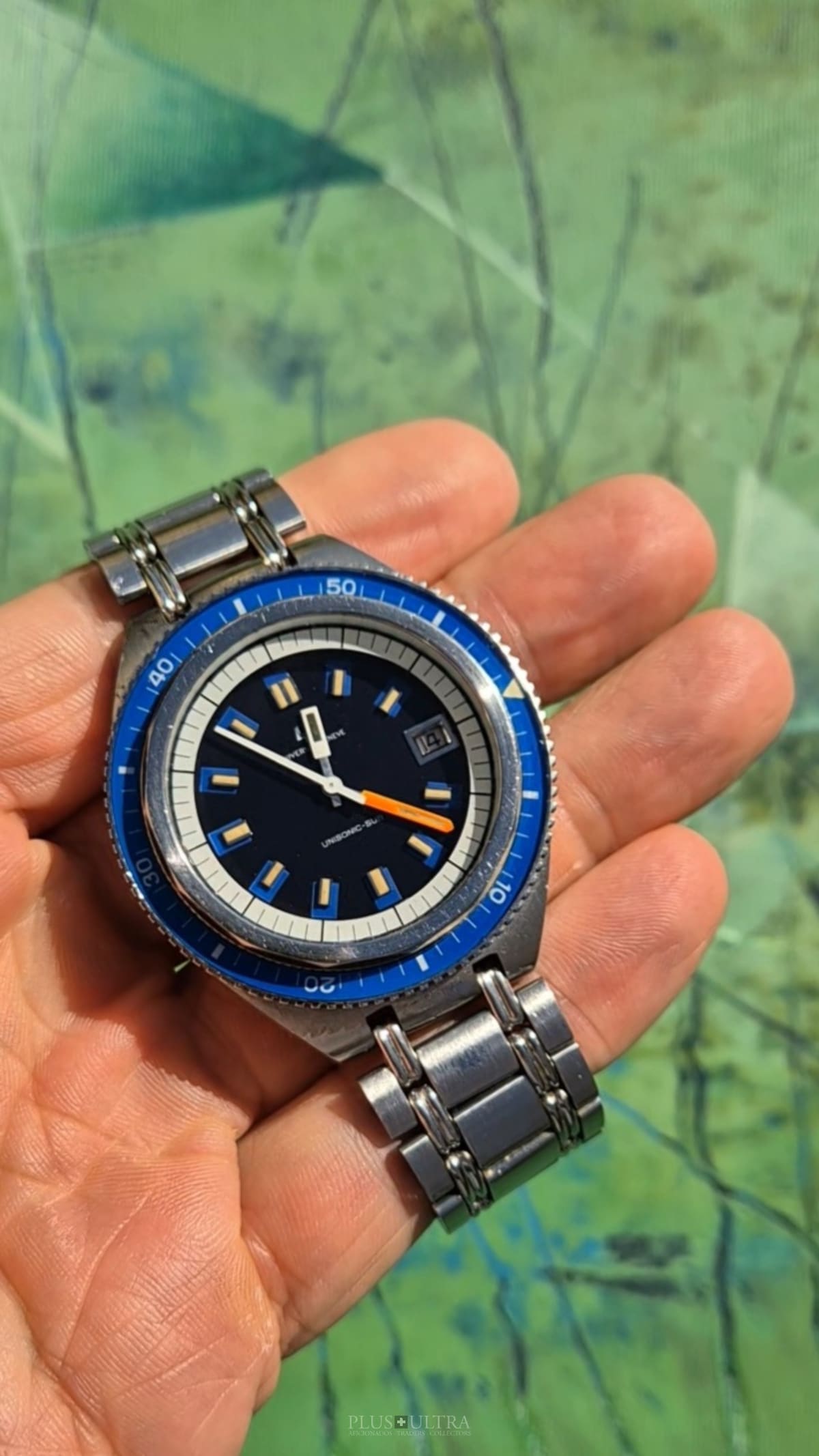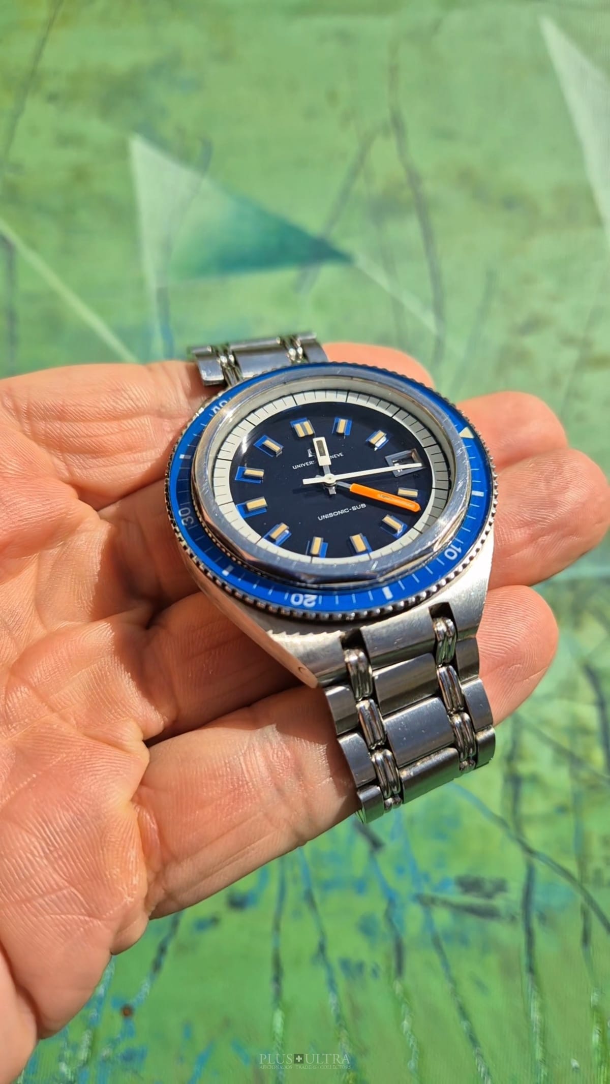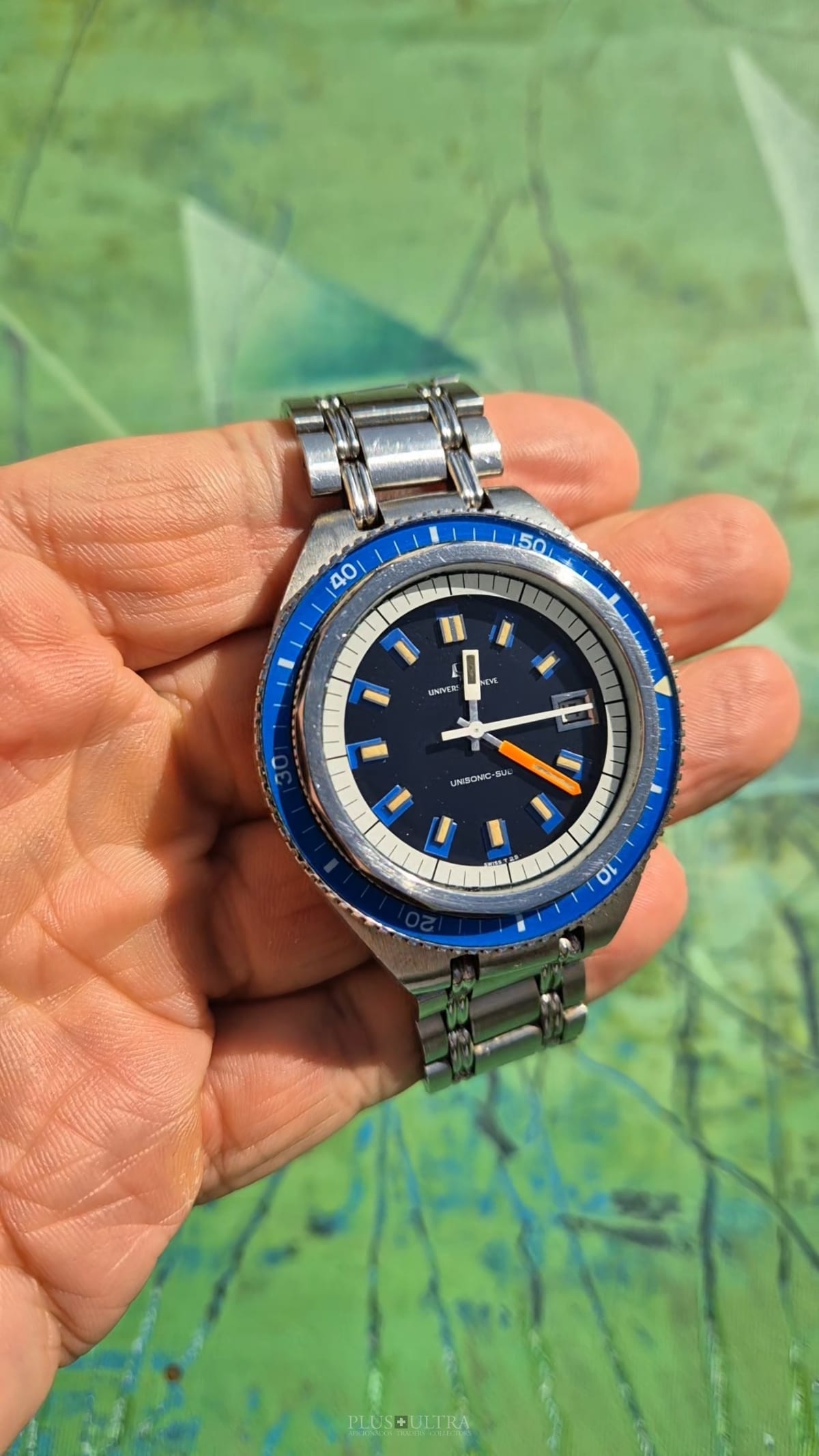 The watch was made in 1969 according to our notes & books and is in beautiful preserved condition. It was the most precise watch in that time and the best UG had to offer: UG guaranteed a deviation of less than one minute per month -- nothing that was achievable with a mechanical PoleRouter. The screwed crown made it water-resistant and the flexible Gay Freres-Bracelet (dated 1969-Q3, fits up to 20cm) gives this diver an unmistakable character -- the wrist-presence is already given by its size.