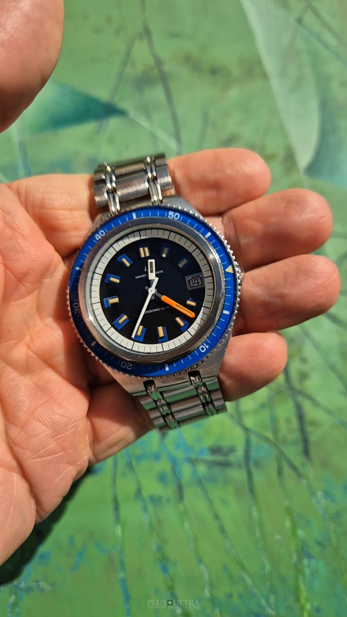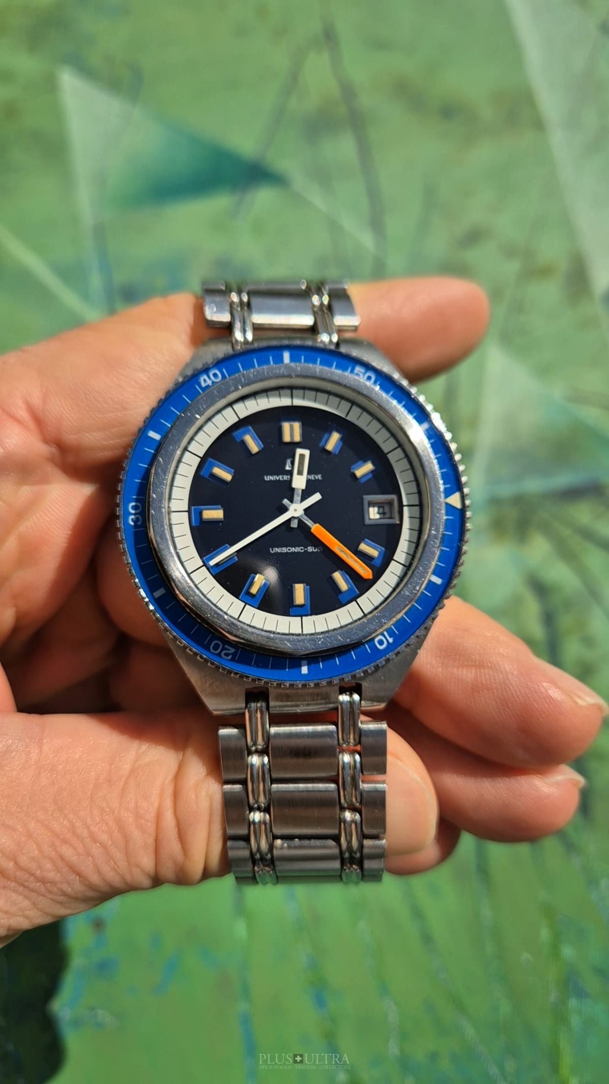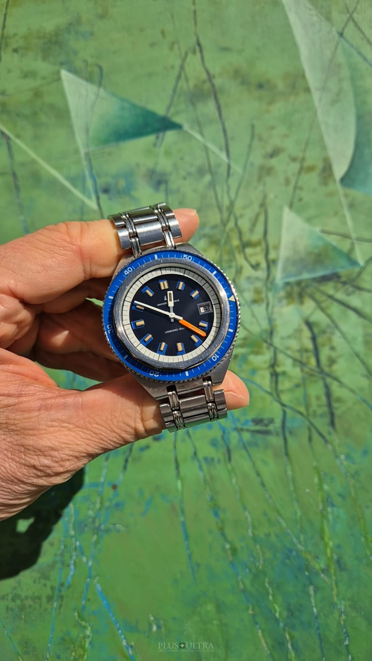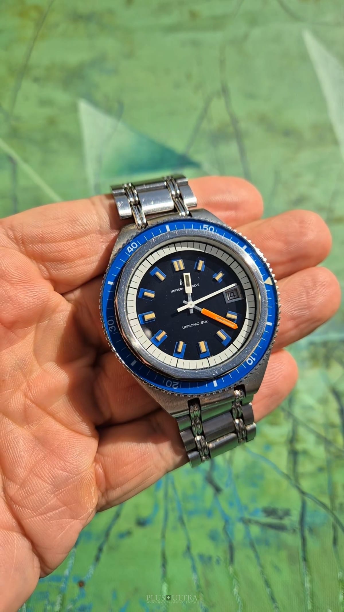 The watch was made in 1969 according to our notes & books and is in beautiful preserved condition. It was the most precise watch in that time and the best UG had to offer: UG guaranteed a deviation of less than one minute per month -- nothing that was achievable with a mechanical PoleRouter. The screwed crown made it water-resistant and the flexible Gay Freres-Bracelet (dated 1969-Q3, fits up to 20cm) gives this diver an unmistakable character -- the wrist-presence is already given by its size.