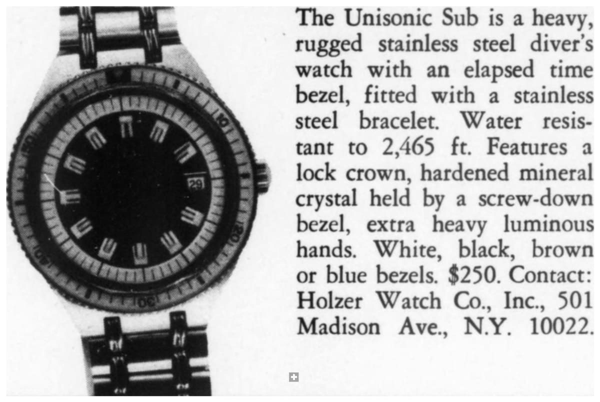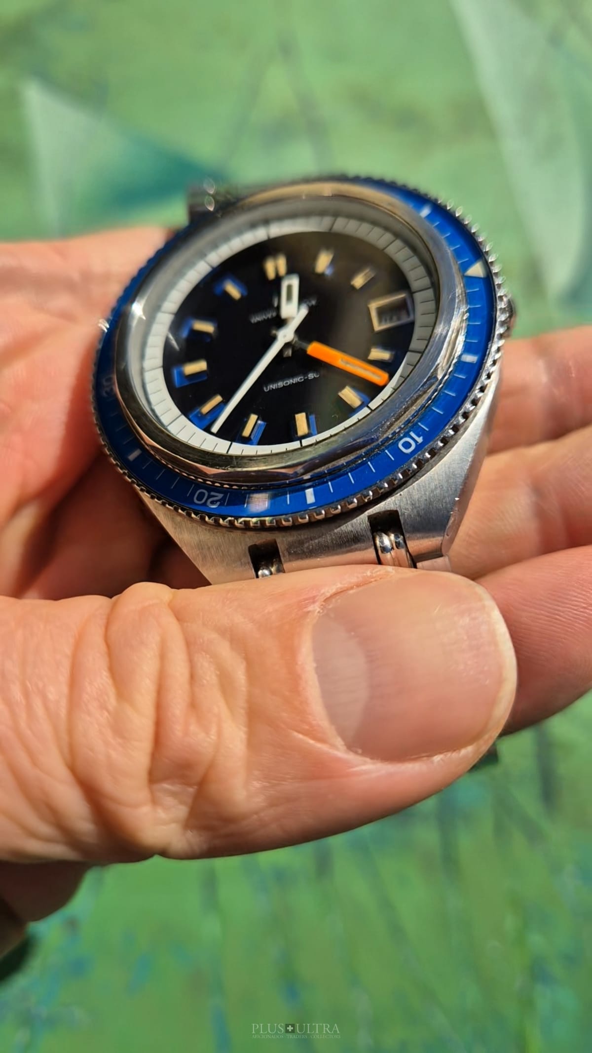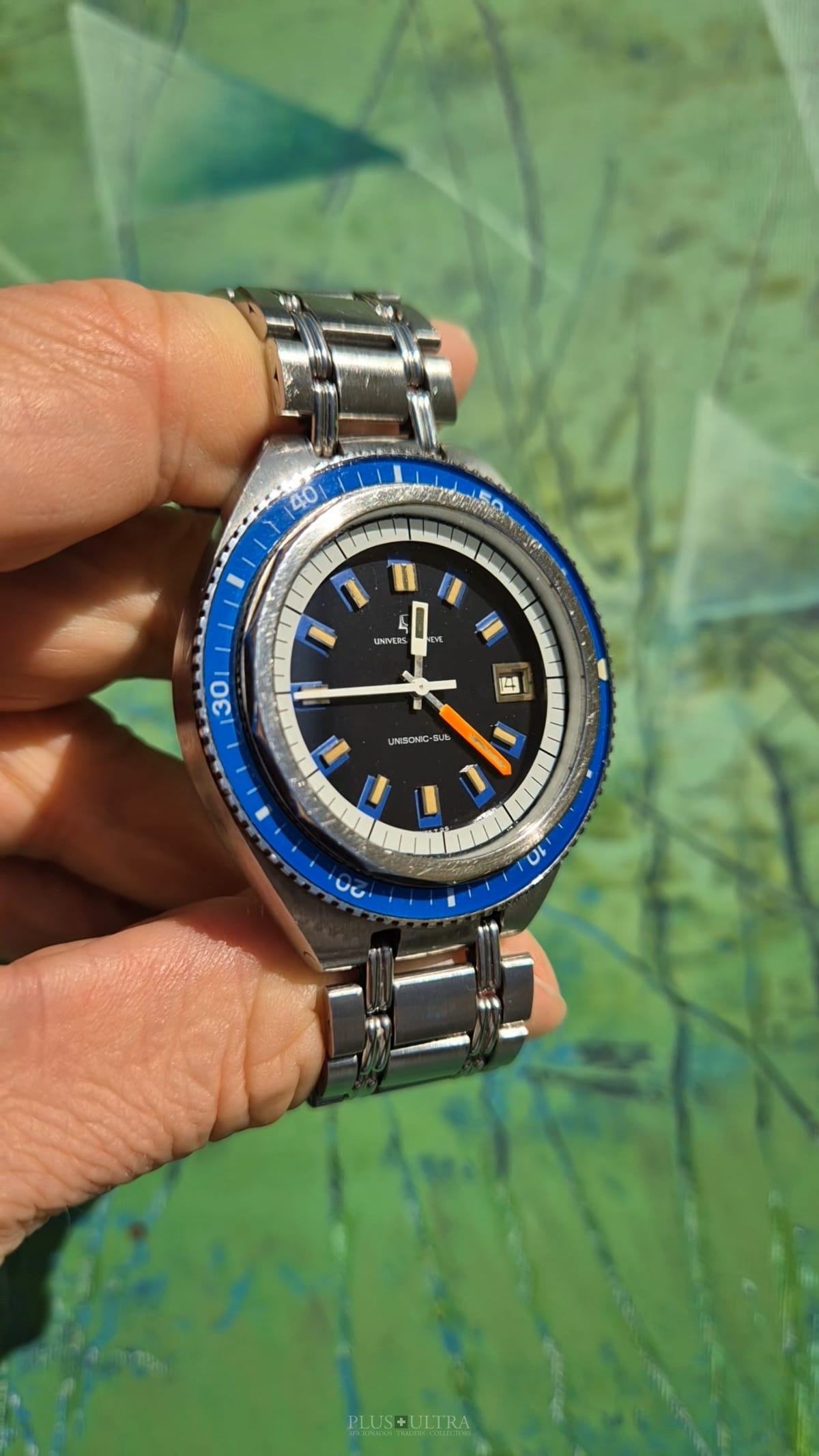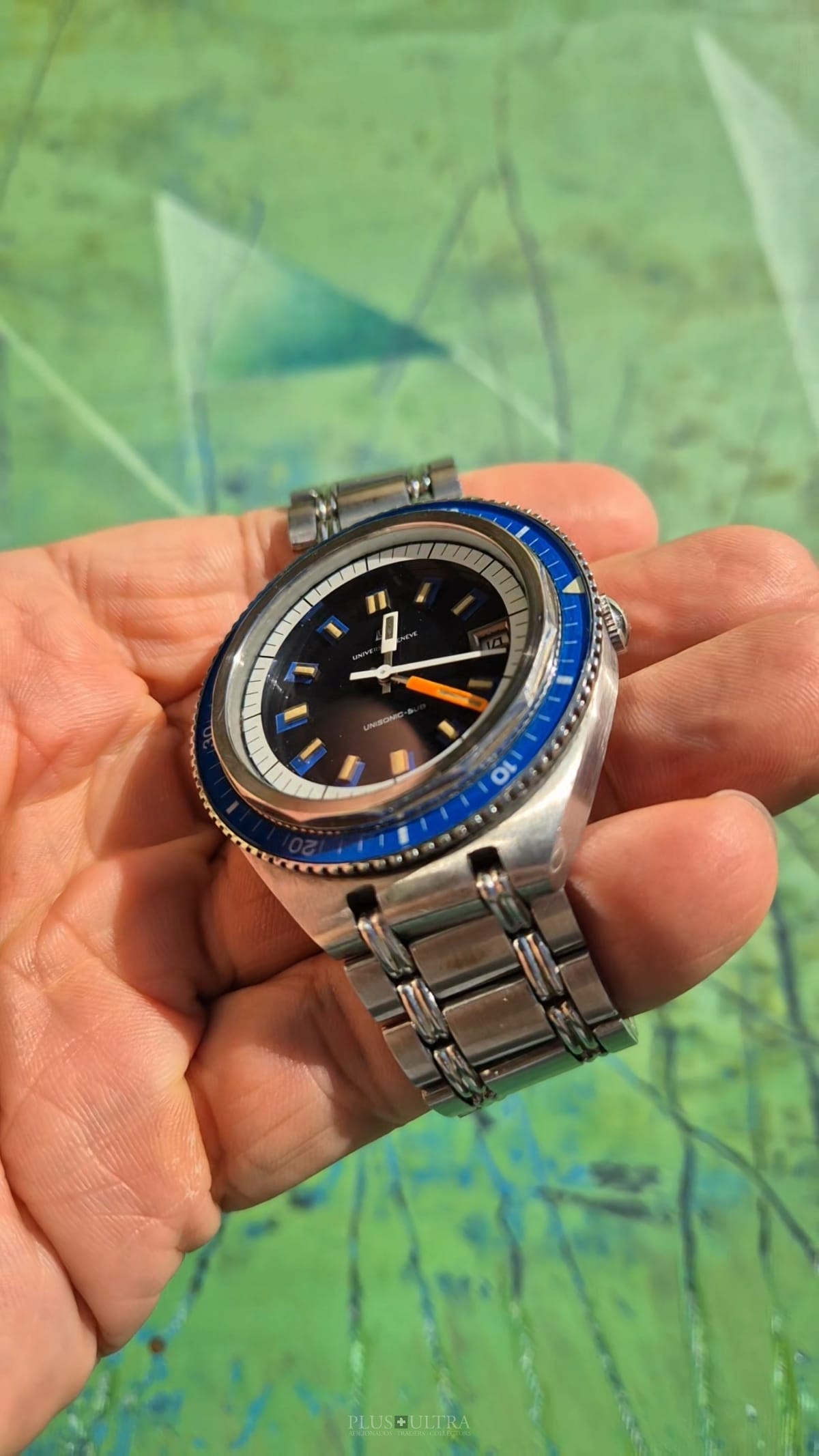 The watch was made in 1969 according to our notes & books and is in beautiful preserved condition. It was the most precise watch in that time and the best UG had to offer: UG guaranteed a deviation of less than one minute per month -- nothing that was achievable with a mechanical PoleRouter. The screwed crown made it water-resistant and the flexible Gay Freres-Bracelet (dated 1969-Q3, fits up to 20cm) gives this diver an unmistakable character -- the wrist-presence is already given by its size.