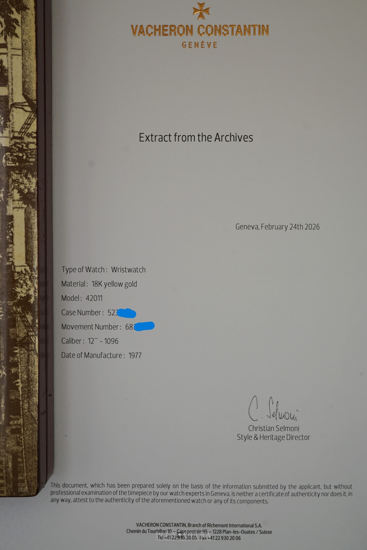 Coming in excellent condition with box (inner & outer) and original unused VC-strap & original 18K-buckle plus the Excerpt of the Vacheron Constantin-Archive stating the watch was produced in 1977.