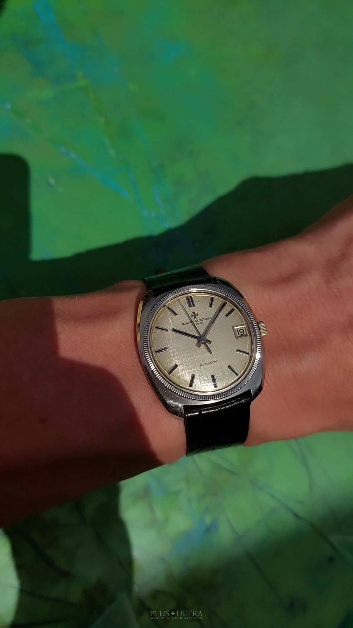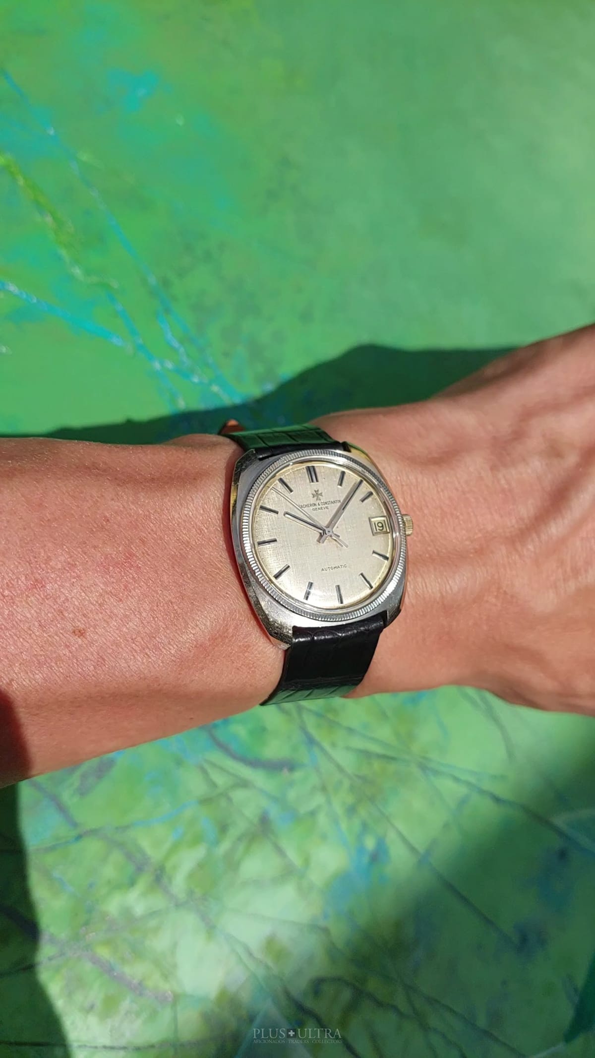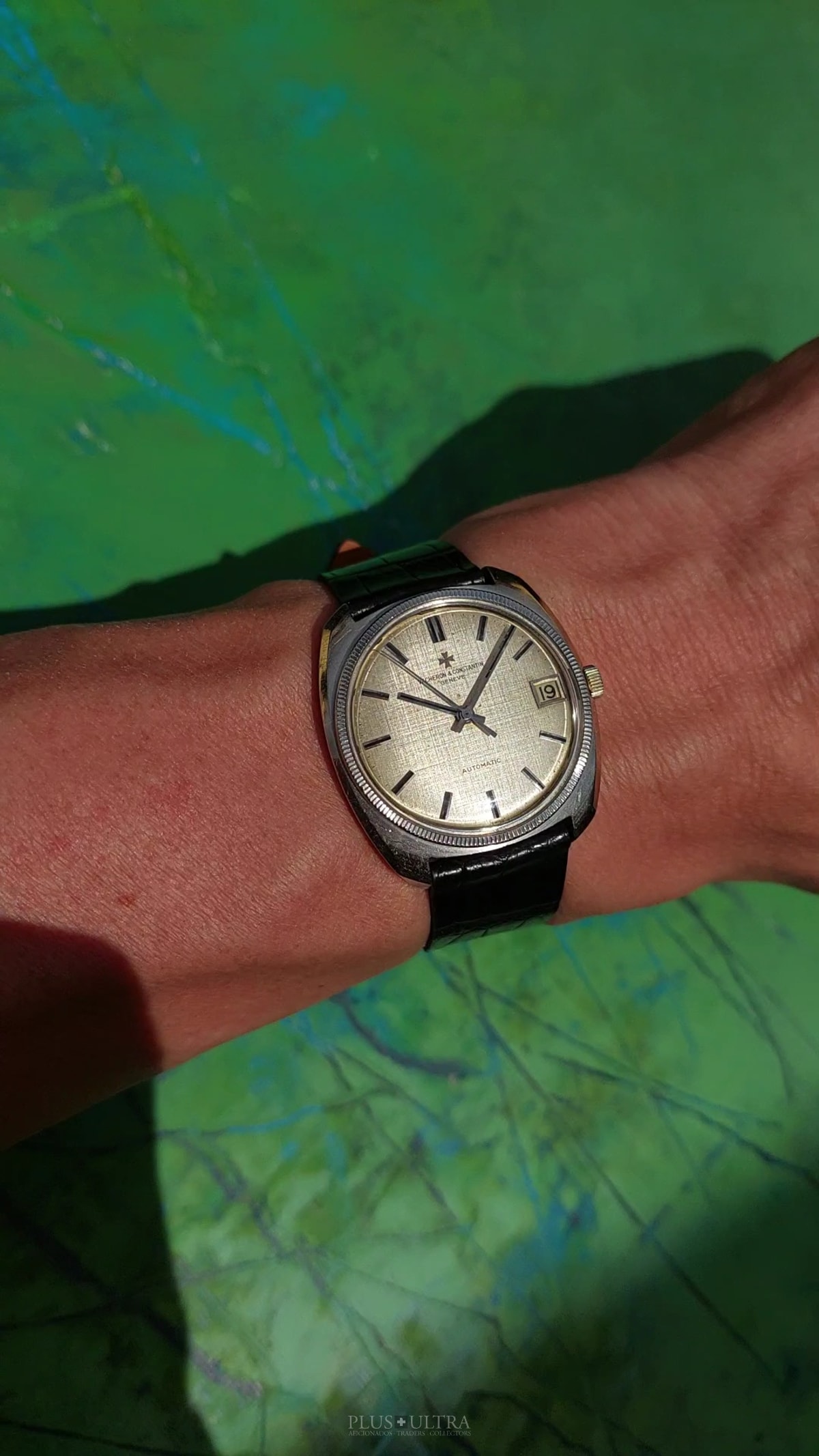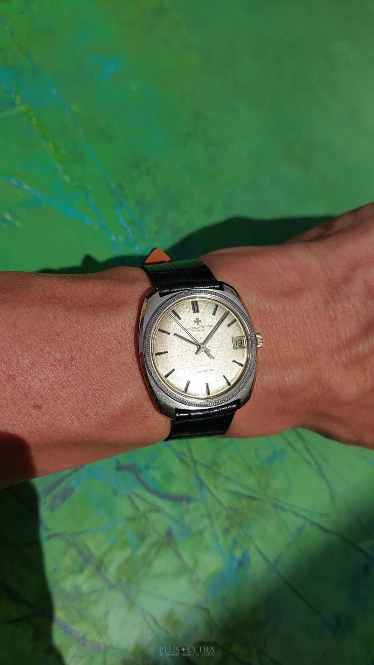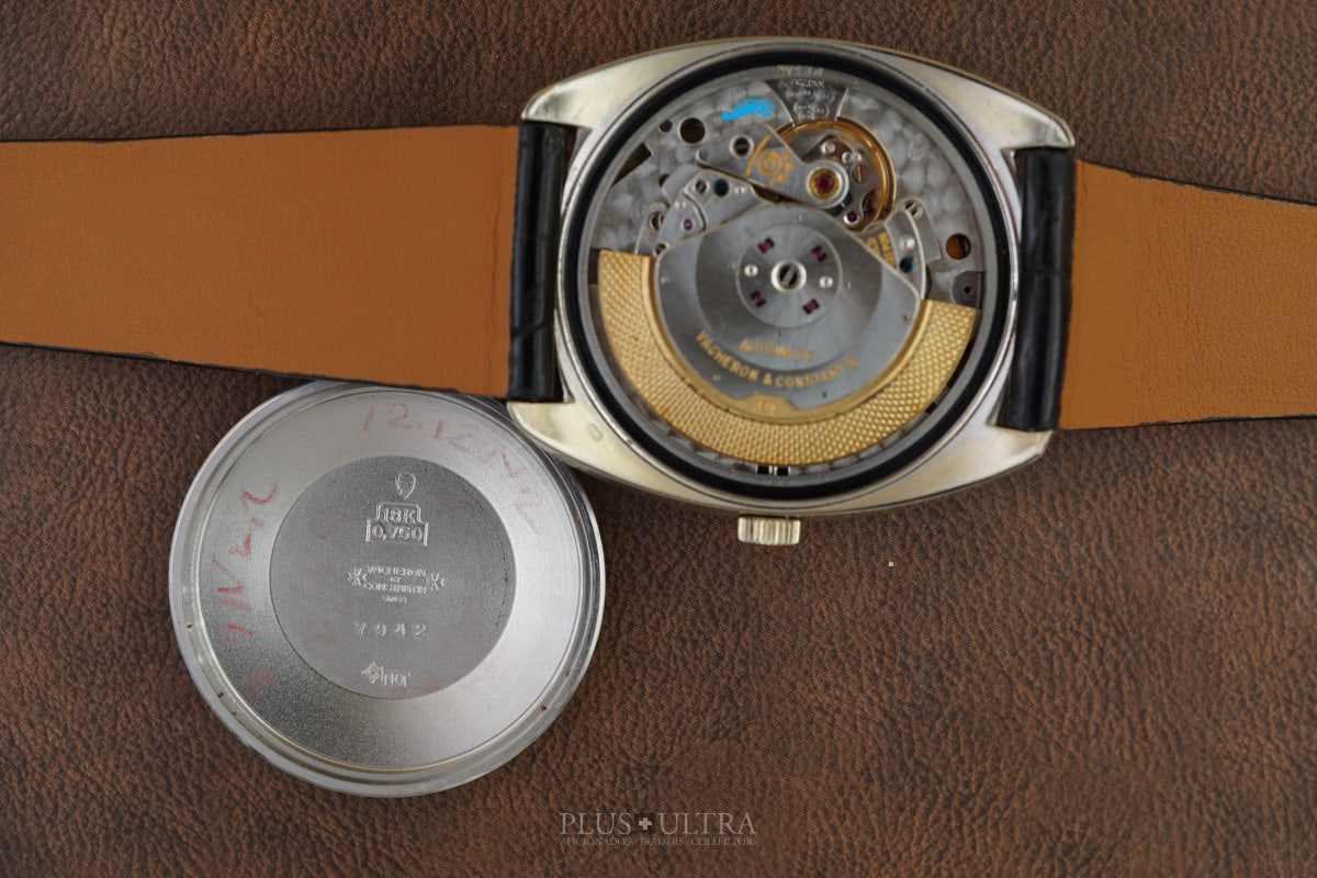 Important and sophisticated VC-automatic using the characteristic caliber K1072 in rare whitegold-variant with a slightly hued patinae-linen-dial. The base cal1070 was introduced in 1959 and this K1072 is the date-variant: probably the most characteristic automatic-movement at all with its four ruby-rollers near the center of the rotor.