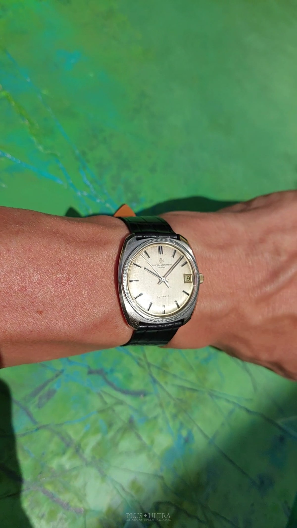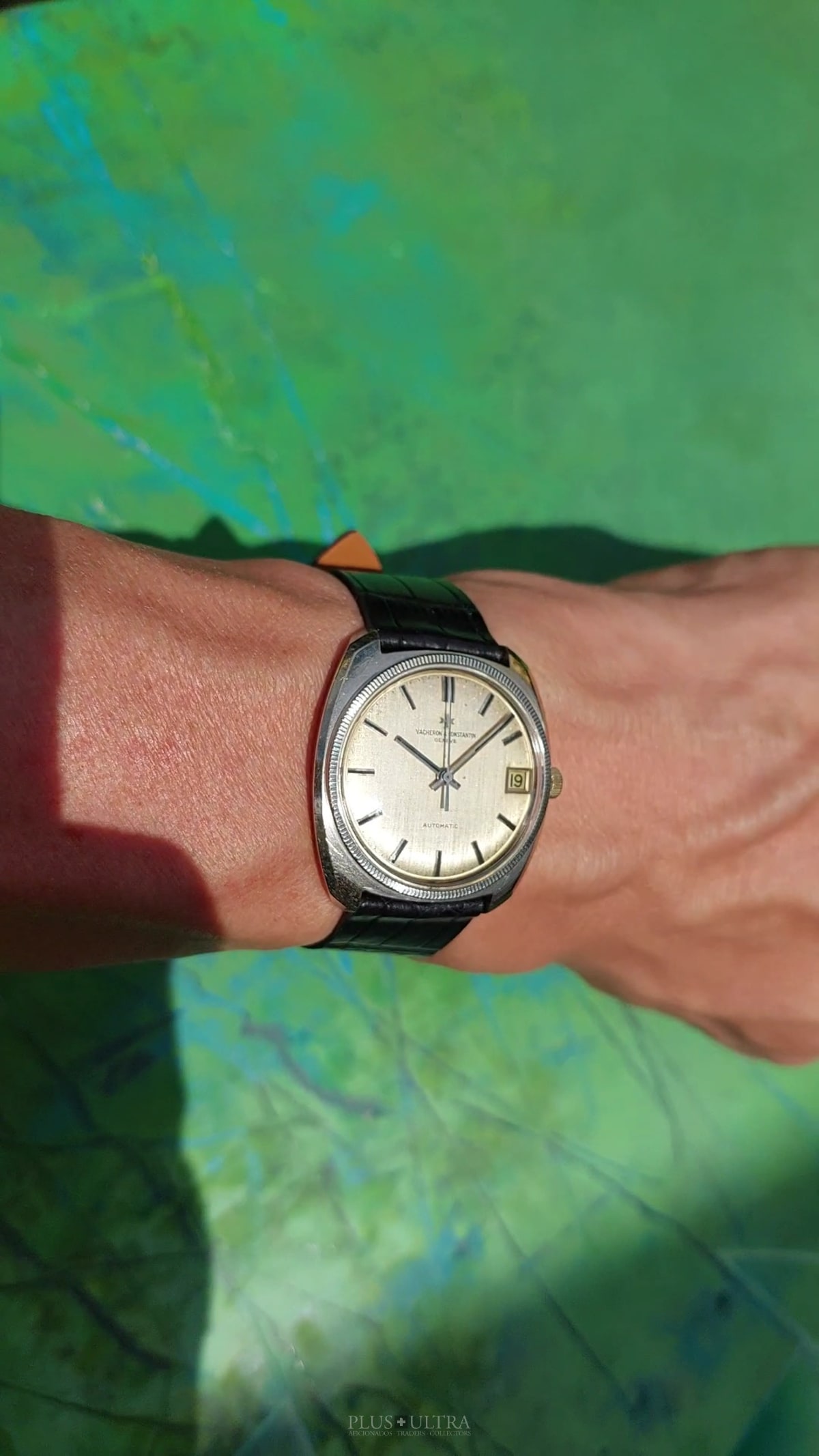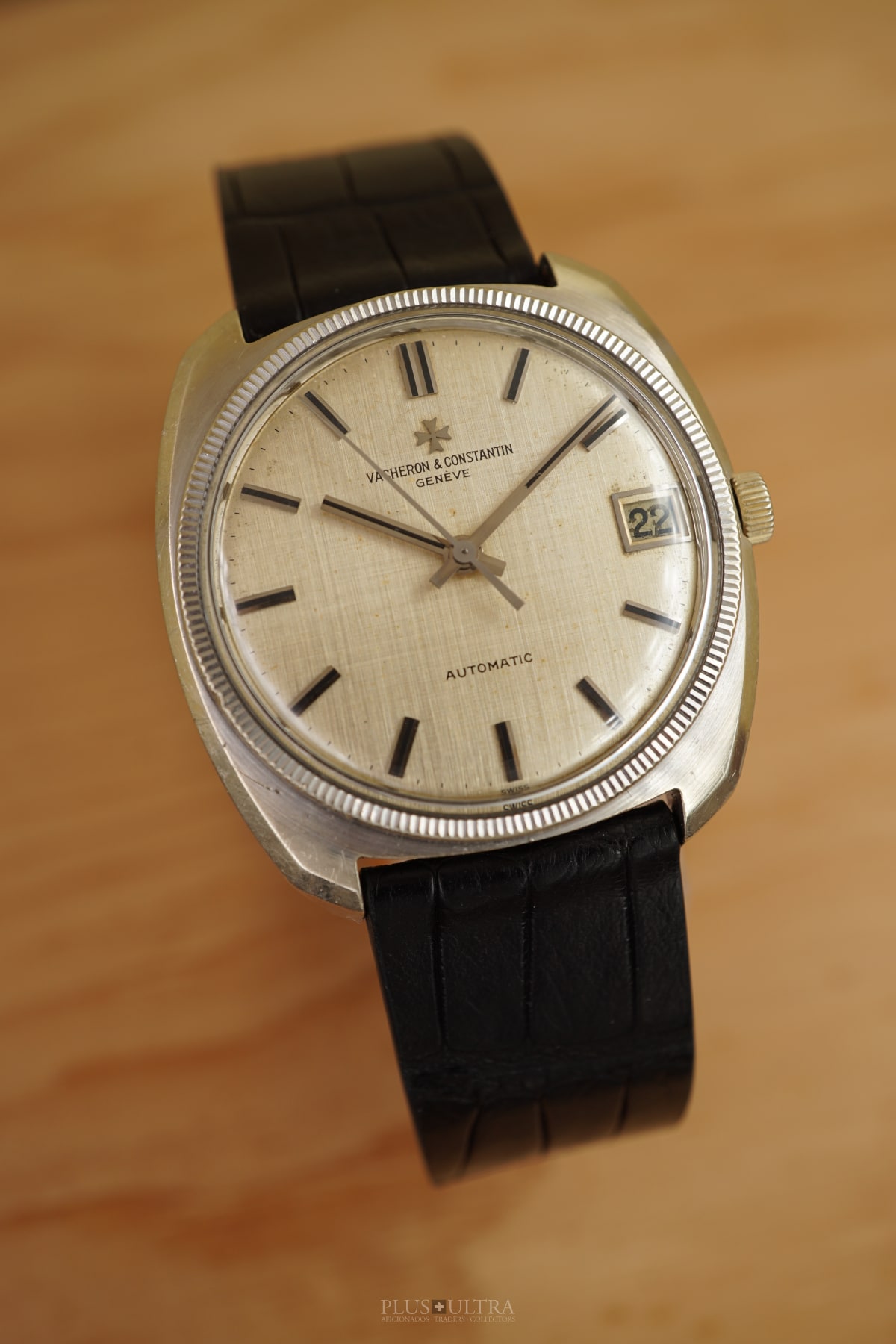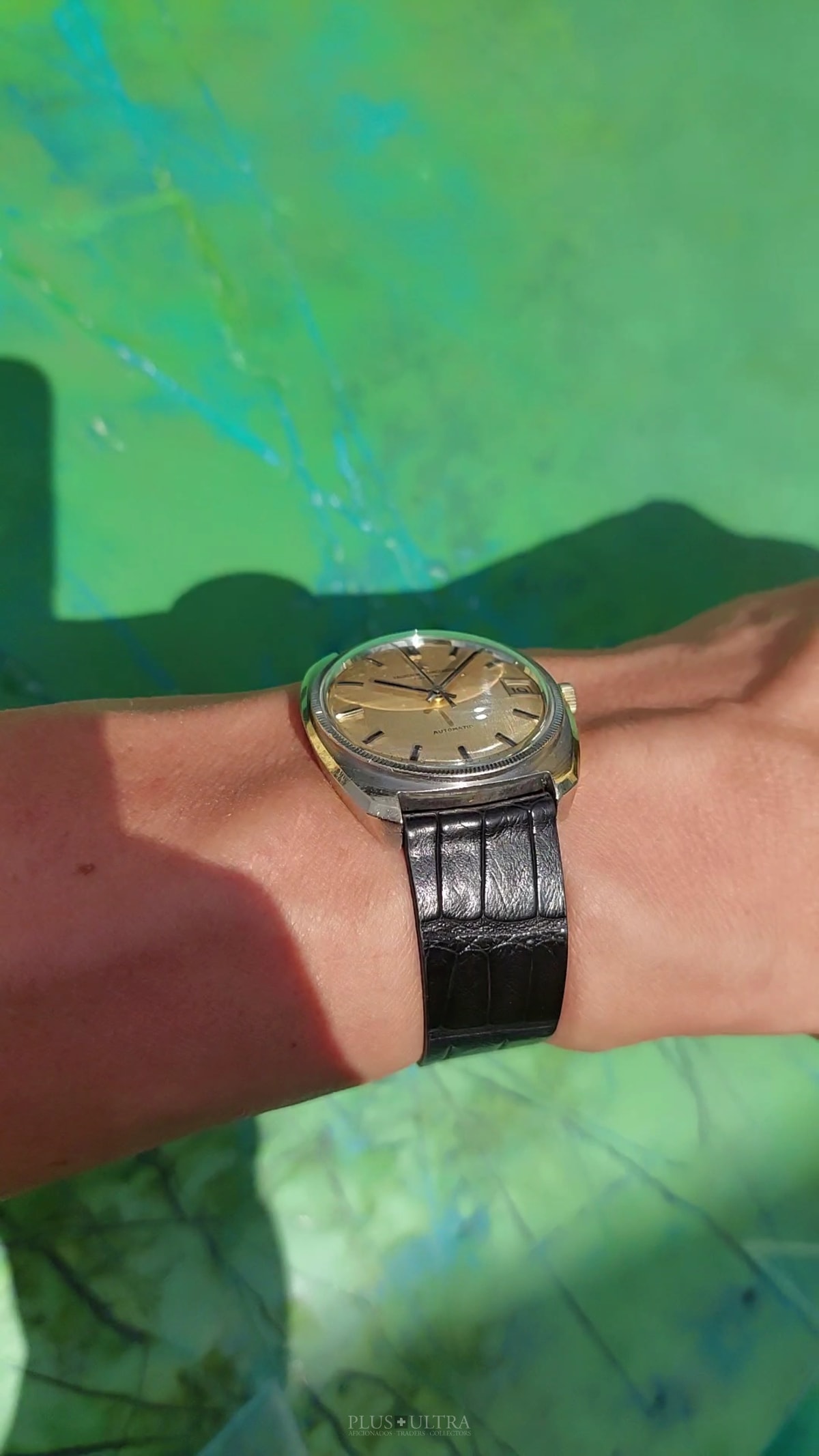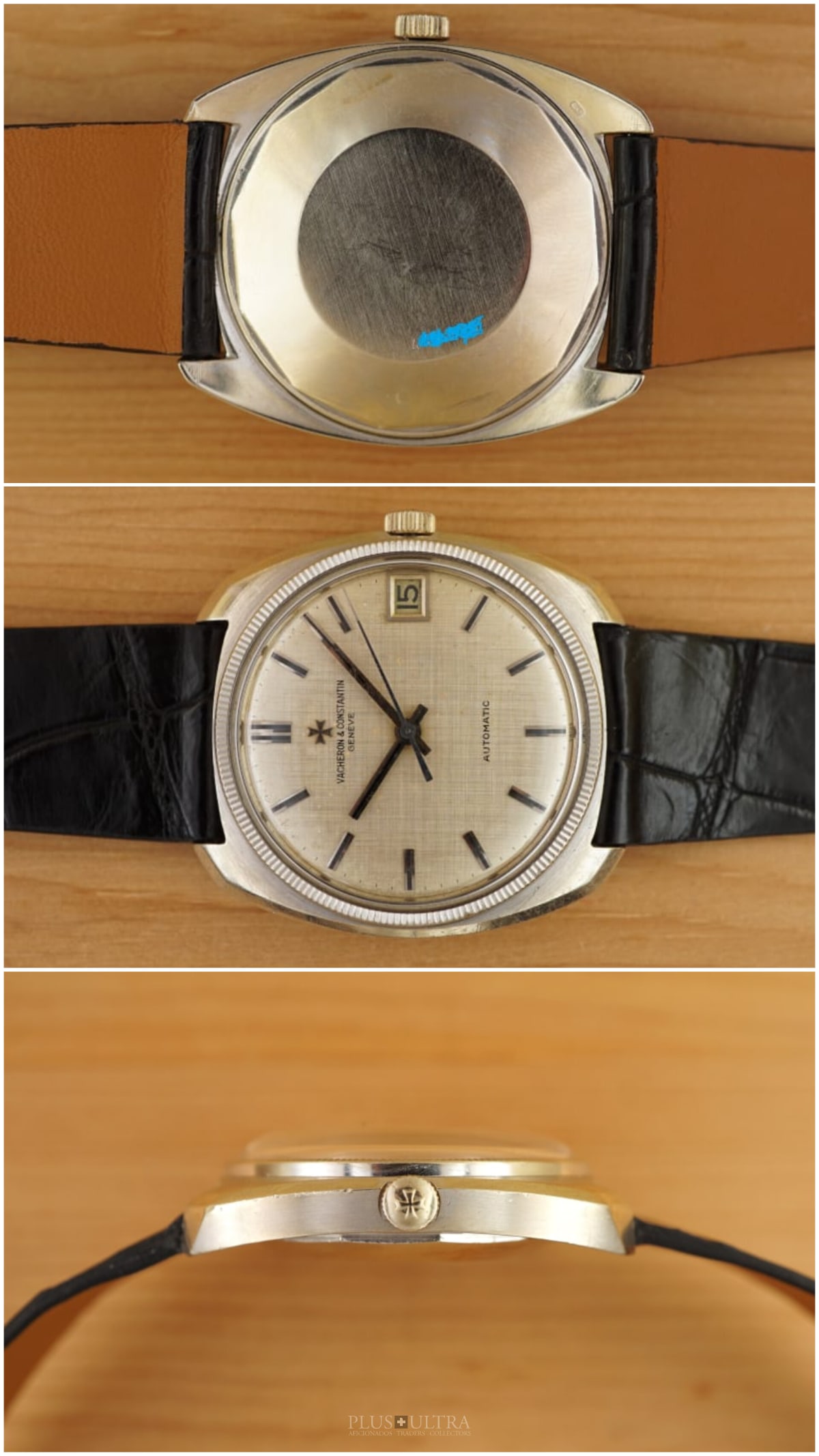 Important and sophisticated VC-automatic using the characteristic caliber K1072 in rare whitegold-variant with a slightly hued patinae-linen-dial. The base cal1070 was introduced in 1959 and this K1072 is the date-variant: probably the most characteristic automatic-movement at all with its four ruby-rollers near the center of the rotor.